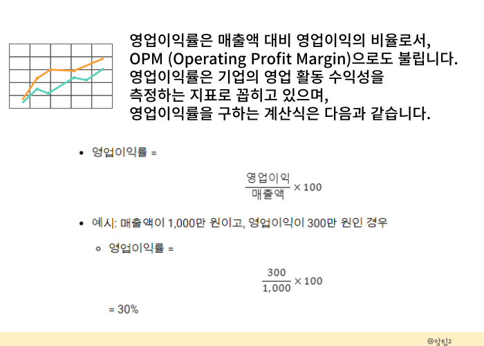 예를 들어, 매출액이 1,000만 원이고, 영업이익이 300만 원이라면 영업이익률은 30%가 됩니다.